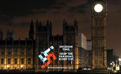 קיצוניות שעלולות להיכנס לפרלמנט. תנועת EMMA האנטי-פשיסטית הקרינה הלילה צלב קרס על בית הפרלמנט במרכז לונדון תחת הכותרת: "זמן ההכרעה - שמרו את הימין הקיצוני בחוץ".