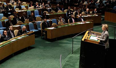לא התייחסה לישראל. קלינטון במטה האו"ם, הלילה (צילום: AP)