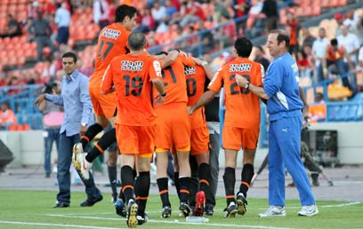 שחקני בני יהודה חוגגים את שער היתרון (צילום: עוז מועלם)