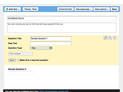שאלונים - בחלון הראשי של השירות לחצו על כפתור Create new ואז ביחרו ב-form. בחלון החדש שנפתח תוכלו לתת שם לשאלון ולמלא אותו בשאלות כאוות נפשכם (לחצו על Add item כדי להוסיף שאלות במבנה מסוים, מעבר עמוד או כותרת ביניים).