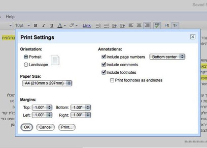 עימוד - מעבד התמלילים של גוגל מאפשר להגדיר מראה עמוד מותאם אישית להדפסה. בתפריט File ביחרו ב-Print Settings ובחלונית שתיפתח תמצאו מספר משתנים: הדפסה אנכית או אופקית, גוגל הנייר, רוחב השוליים, האם והיכן לכלול את מספרי העמודים והאם להדפיס הערות המשולבות במסמך.