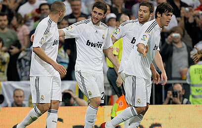 בנזמה (משמאל) עם החברים בריאל מדריד (AP)