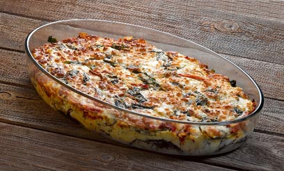 - מוציאים את הפשטידה ומגבירים את חום התנור ל-250 מעלות. מסדרים את שארית הסנט מור בפרוסות על הפשטידה ומחזירים לתנור לכ-3 דקות עד שהגבינה משחימה ומבעבעת. מגישים מייד.