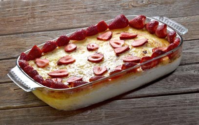 - לאחר האפייה מצננים את העוגה בטמפרטורת החדר. מעטרים בפיסות תותים ושומרים בקירור.