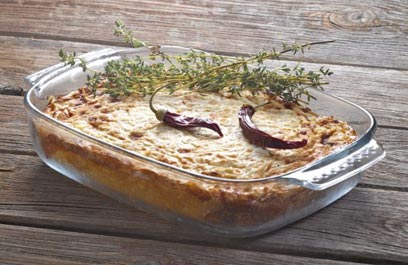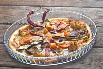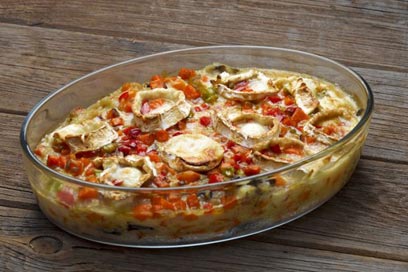 - מסדרים בתחתית תבנית הפיירקס את הפטריות הקלויות, ומניחים מעליהן חצי מתערובת הגבינות. מעל הגבינות מסדרים את הפלפלים הקלויים ומעליהם מפזרים עלי בזיליקום. מוסיפים את שארית תערובת הגבינות, מפזרים מעל את הפטרוזיליה הקצוצה. מכסים את התבנית בנייר אלומיניום ואופים בתנור שחומם ל-180 מעלות כ-15 דקות. מסירים את נייר האלומיניום ואופים עוד עשר דקות.