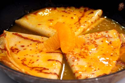 - מקפלים כל קרפ ל-4, ממיסים חמאה במחבת רחבה ומוסיפים את הקרפים, מחממים לחום גבוה ואז יוצקים את ליקר התפוז, מקרבים בזהירות גפרור אל המחבת ומדליקים. כשהלהבות נרגעות, מוסיפים את הרוטב לבישול של עוד דקה.