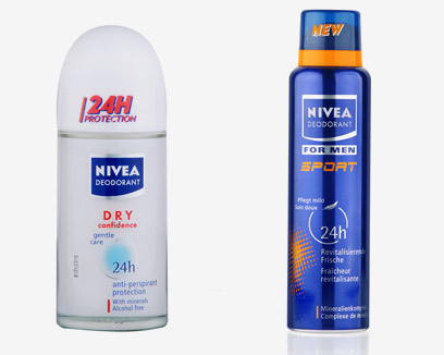 NIVEA משיקה קולקציית דאודורנטים בניחוחות מרעננים לגבר ולאישה במארז ספריי, רול און וסטיק. הדאודורנטים אינם מכילים חומרים משמרים ואלכוהול. מחירים למוצרים לגבר: ספריי דאודורנט ספורט – 31 שקל ל-150 מ"ל. מחירי המוצרים לאישה: ספריי - 33 שקל ל-150 מ"ל; רון און - 33 שקל ל-50 מ"ל; סטיק - 33 שקל ל-40 מ"ל.