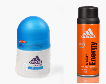 אדידס מציעה דאודורנט ספריי לגוף Deep Energy. הספריי, בעל ניחוח ענברי בשילוב עצי הדר ומנדרינה שנשאר על הגוף לאורך זמן, עשוי תרכובת אורגנית של פירות וצמחים ומשולב בניחוח עץ תפוח ירוק מהול בתמצית הל. מחיר: 30 שקל ל-150 מ"ל. בנוסף אדידס מציגה את Action 3- דאודורנט לגבר ולאישה עם נוסחה חדשנית לספיגת זיעה אקטיבית. מחירים: ספריי - 26.90 שקל ל-200 מ"ל; רול און - 26.90 שקל.