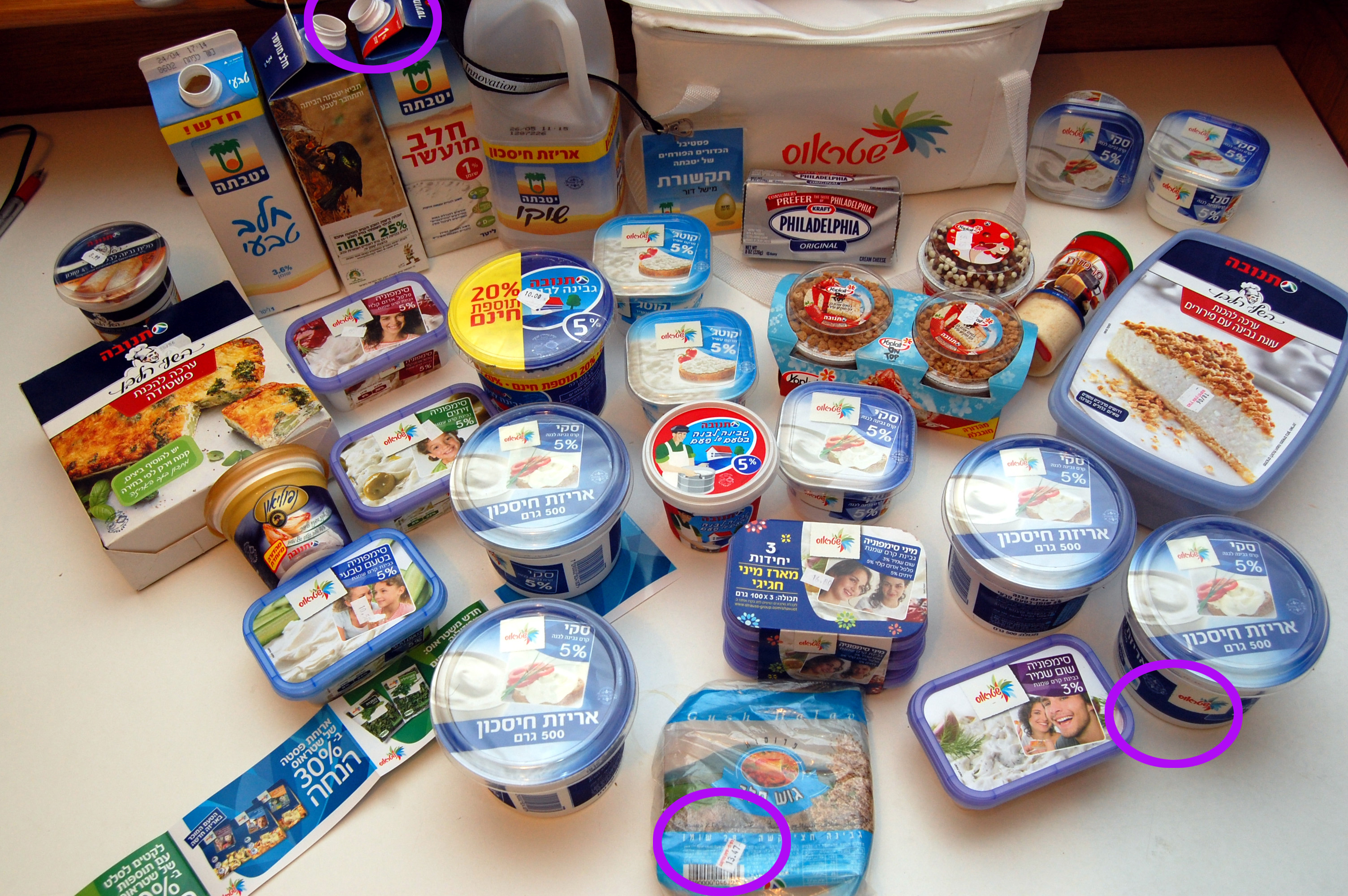 חידת שבועות לא הציבה בפניכם אתגר כלל ועיקר. אני חוזר ומזכיר לכולכם כי אני מבצע שלושה שינויים בלבד, והאמת שהיה חביב לראות שרבים מצאו בעיות שכלל לא יצרתי. ולעניין: הדבר הראשון שמחקתי הוא תבריג הפקק בקרטון החלב האמצעי מתוך השלושה בצד שמאל למעלה של התמונה. לאחר מכן הזזתי את הנקודה והעליתי את מחיר הגבינה הצהובה בעשרת מונים ולבסוף דחסתי חמישה קילו גבינה לבנה לקופסה קטנה. לפניכם התמונה המקורית עם עיגולים שבהם רואים את המצב המקורי לפני ההתעללות שלי.
