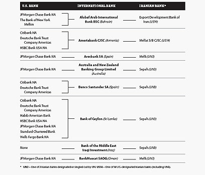 משטר הסנקציות אמנם אוסר על קיום קשרים עם בנקים באיראן, אולם 18 בנקים אמריקניים מקיימים בעקיפין קשרים פיננסיים עם הרפובליקה האיסלאמית. בדרך זו מצליחה טהרן לשים את ידיה על כסף הדרוש לה למימון תוכנית הגרעין ולהענקת סיוע לארגוני טרור, כמו חיזבאללה וחמאס.
