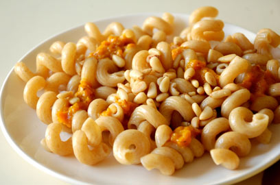 פסטה עם מחית פלפלים צהובים קלויים וצנוברים