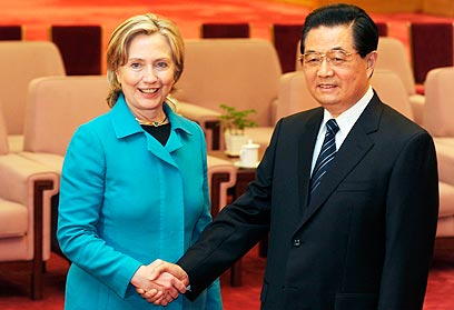 קלינטון ונשיא סין הו ג'ינטאו, היום בבייג'ינג (צילום: רויטרס)