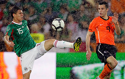 שחקנה של ריאל מדריד מסר מצד שמאל, רובין ואן פרסי ניצל את האיטיות של בלמי מכסיקו והחלקה של השוער גיירמו אוצ'ואה על המשטח הבוצי - ובעט מקרוב לרשת.