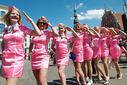 לבושות בוורוד, שערן הבלונדיני זוהר באור השמש האביבית, צעדו אתמול (שבת) מאות נשים בהירות שיער בריגה בירת לטביה - בצעדה שנועדה לרומם את מצב רוחם של אזרחי המדינה שבמיתון, ולאסוף תרומות לצדקה.