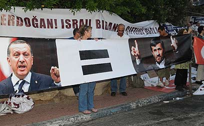 לא מסתפקים בביטול הנופש באנטליה. מאות אזרחים התאספו הערב (יום ב') להפגין מול שגרירות טורקיה בתל אביב, במחאה על המעורבות הטורקית הנרחבת במשט לעזה שהסתיים במרחץ דמים. המפגינים נושאים דגלי ישראל ושרים את ההמנון הלאומי, ומבקשים להעביר מסר לממשלה הטורקית שלא להתערב בענייני פנים של ישראל. בין השלטים שנישאו בהפגנה: "פרובוקציה זו לא דרך לשלום", "לעצור את החמאס", "ישוחרר גלעד שליט", "הרוגים ופצועים, הטורקים מרוצים" ו"ארדואן איסלאמו-פשיסט".