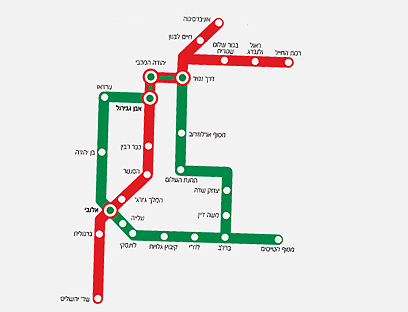 באדום - קו "חוצה", בירוק - קו "סובב"