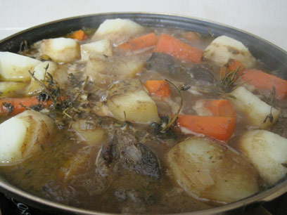 - מוסיפים את הגזרים, תפוחי האדמה החתוכים והטימין.