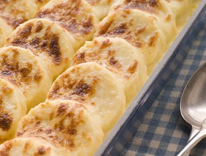 - מעבירים את העיגולים לתבנית אפייה משומנת ומסדרים אותם כך שהם חופפים זה לזה.