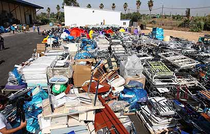 מתחם משרד הביטחון הסמוך לבסיס צריפין הפך בימים האחרונים למחסן זמני של מאות טונות ציוד שיועד לתושבי הרצועה, הכולל בעיקרו מיטות, מזרנים, ספות, ציוד רפואי, נעליים, בגדים ותרופות שתוקפן של חלק מהן פג.