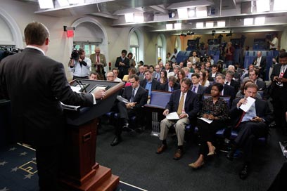 התדרוך היום בבית הלבן והכסא הריק של תומאס (צילום: AP)