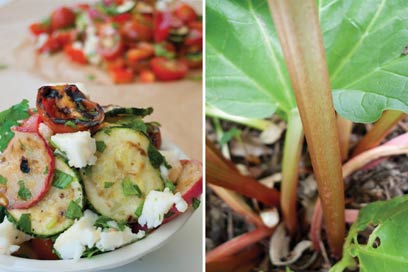 - משמנים שוב את מחבת הפסים. מניחים את הצנוניות הפרוסות (כן, צולים את הצנוניות!), גבעולי הבצל הירוק השלמים ופרוסות הקישואים על המחבת וצולים עד שמופיעים סימני חריכה. הופכים וצולים את הירקות מהצד השני.