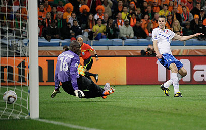 דקה 36 - שער! ההולנדים תירגמו את היתרון הברור שלהם במשחק לגול, כשרובין ואן פרסי כבש את שערו הראשון במונדיאל 2010, 0:1 מוצדק להולנד.