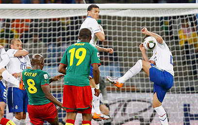 ואן דר וארט נוגע בכדור בידו ומעניק פנדל לקמרון (רויטרס)