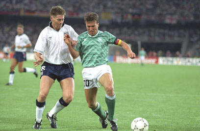 לותר מתיאוס וכריס וודל בחצי הגמר באיטליה 90' (גטי אימג'ס)
