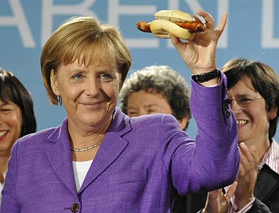 אנגלה מרקל מציגה נקניקייה לפי החוק (צילום: רויטרס)