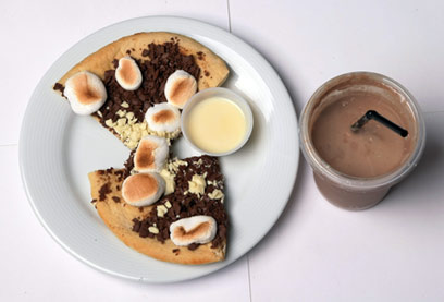 נו, תראו לנו ילד אחד שיסרב להיכנס למסעדה הזאת, המבוססת בחדווה באגמי שוקולד מפכים. התפריט המיוחד לילדים נקרא "מקס ותפריט השוקולד הסודי" – ושם יש מנות כמו "שניצל של מר שפיצר, עם קטשופ מתוך שפריצר, צ'יפסים מהצ'יפסר וירקות חתוכים במיקסר 36) ש"ח). יש גם מזרק ענק מלא שוקולד שמשפריצים ישר לפה 15) ש"ח,( ואפשר לשתות "שוקו מתוק עם קצף חלב שעושה שפם" 17) ש"ח.( התפריט מלא גימיקים חביבים, ואי אפשר לומר שלא השקיעו פה מחשבה בבניית הרכבי מנות בלתי שגרתיים בעליל – גם אם הם יעלו את רמת הסוכר בדם הילדים, עוד בטרם נגסו את הביס הראשון.