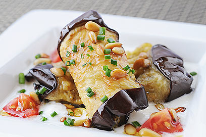 גלילות חציל במילוי גבינת עזים על מצע יוגורט