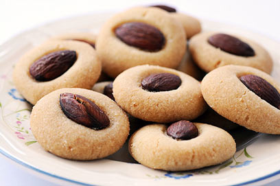 - מגלגלים לכדור קטן (אפשר להשתמש בכפית למדידה: מניחים על הכפית חתיכת בצק שטוחה וזו הכמות שצריך לגלגל. כמות גדולה יחד עם זמני אפייה משתנים ישנו את גודלה של העוגייה). לאחר שמגלגלים לכדור, משטחים בעדינות את הבצק, מוסיפים שקד במרכז העוגייה ומשטחים בעדינות את השקד בתוך הבצק.