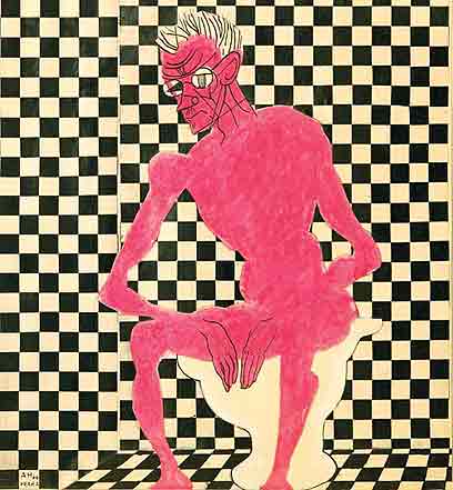 בחירה יפה היתה למקם במרכז הרישומיים הגרפיים בשחור לבן, קולאז' מאוחר יותר, עם קריצה פופית של סמואל בקט בצבע ורוד חזק יושב על אסלה לבנה על רקע של לוח משבצות שחור לבן.