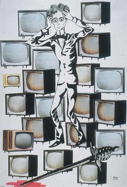 הקולאז' "החזון של קפקא על הטלויזיה" הומוריסטי במיוחד, רישום של דמותו של קפקא עם שתי ידיו על ראשו בבהלה, על גבי שלל מכשירי טלויזיה ישנים מרגיש בהחלט רלוונטי כמה עשרות שנים לאחר מכן, כשחושבים על כמות הג'אנק הטלויזיוני המסמם את מוחינו. אגב קפקא הוא מהדמויות המעטות אותן לא פגש האמן, שכן קפקא נפטר לפני שהחל לצייר דיוקנאות. הרישומים נעשו מתצלומים.