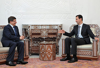 אסד ודבוטאולו, אתמול בדמשק. "לחקור את פשעי ישראל" (צילום: AP)