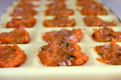 - מניחים בכל שקע בתבנית הרביולי (או במרחקים שווים על דף הפסטה אם לא משתמשים בתבנית) כפית שטוחה של מלית.