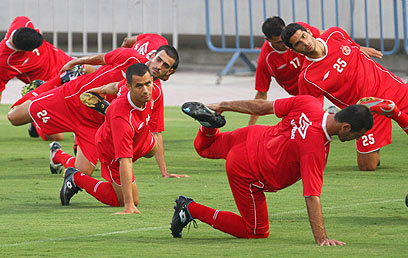 שחקני הפועל ת"א עובדים על גמישות (צילום: אלי אלגרט)