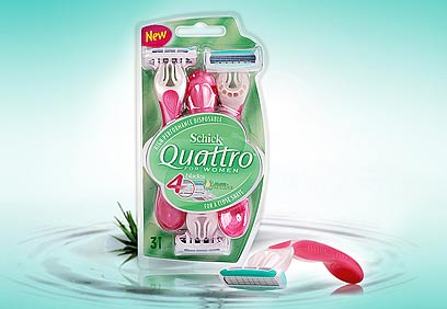 שיק קווטרו לנשים Schick Quattro for Woman – סכין הגילוח היחידה בעל 4 להבים לגילוח קרוב ואיכותי על ידית חד פעמית. בסכין הגילוח שיק קווטרו לנשים, מעל לארבעת הלהבים, קיים פס אלוורה וויטמין E המסייע לתוצאות גילוח איכותיות. מגיע באריזה המכילה 3 סכינים. מחיר האריזה 30 שקל. ניתן להשיג בכל רשתות השיווק והפארם.