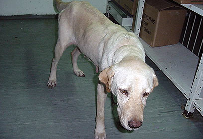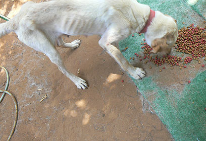 החיה החלשה הובאה לטיפול במרכז הרפואי לחיות ברמת-גן. ד"ר אלון שיינר, מנהל המרכז מספר כי כלבה בריאה מגזע דומה אמורה לשקול לפחות 34 קילוגרם. "הכלבה הגיעה אלינו כשהיא שוקלת 24 קילוגרם בלבד, עם צלעות ואגן בולט. ראו לה את כל חוליות הגב ואפילו עצמות הפנים בלטו מאוד.
