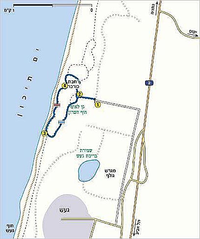 משער הכניסה (נק' 1 במפה) מטפסים בשביל רחב מערבה. לאחר כ-100 מ', בפיצול השבילים (2), פונים שמאלה עם הסימון הכחול, העובר על גבי דיונות חול מיוצבות ופורחות. הצמחייה לצד החוף נאה ומיוחדת. תראו כאן עדעד כחול, עדעד רותמי ורוד ובעונה שמשון צהוב.