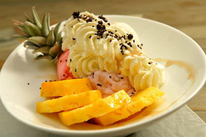 - להגשה: שולים את פרוסות האננס מהסירופ ומניחים בצלחת אובלית עמוקה. מניחים את כדורי הגלידה מעל, מזלפים מעט מסירופ האננס ומוסיפים מעל קצפת בכמות נדיבה. מקשטים במרשמלו.