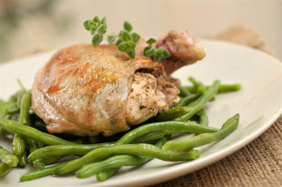 בבית תפשילו שרוולים ותרקחו לכם תערובת תיבול. אם אתם מתעצלים, תוכלו להתארגן מבעוד מועד עם תערובת תבלינים או ממרח מוכן, לפי טעמכם: מתערובות עשבי תיבול ועד תערובת תיבול לבשר או לעוף, וממרחים כמו פסטו, צ'ימיצ'ורי, חריסה או סחוג – הכל הולך. אחר כך תרימו בזהירות את העור מעל הבשר, תדחפו את התיבול מתחתיו ותצמידו את העור למקום. 20 דקות בתנור חם מאוד והמנה העיקרית מוכנה.