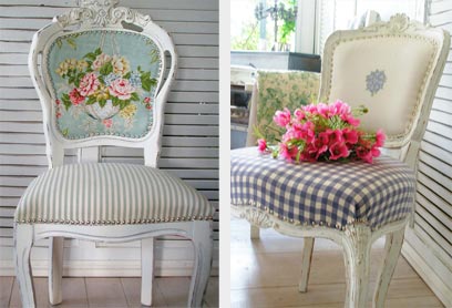 כסא ישן ששופץ ורופד בבד משבצות במראה פרובאנסלי וכסא ישן ששופץ ורופד בבד פרחוני ובד פסים בסגנון כפרי רומנטי (צילומים: ענת סגל)