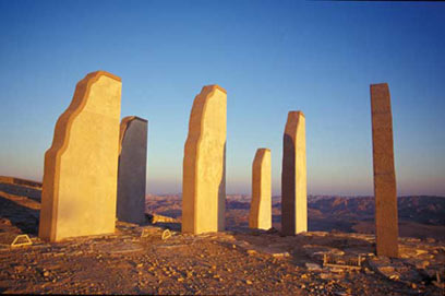 מתחם המדיטציה", חצי קשת הבנויה ממש על קצה שפת המכתש ומשקיפה על מרחבים מעוצבים בני 100 מיליון שנה, משלבת בין שיש, בטון וסלעים, שביניהם מסורגים חלילי רוח עדינים, "ספינת המדבר" היא עיגול של שמונה עמודים שבמרכזם מפרש מתכת, ובראש כל אחד מהם דג פעור פה שהרוח החולפת בו שולחת את הדמיון למחוזות רטובים, ב"נדנדת התופים" מולאו כיסאות המושבים באבנים מרשרשות ו"שדרת פעמוני הרוח" המרשימה, שנראית מרחוק כמו מיזם טכנולוגי-מדעי, מתבררת מקרוב כיצירה פשוטה שמפיקה צלילים רגועים-רגועים.