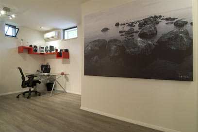 גפן בחרה בעיצוב שלא מכביד על החדר ושמשדר בגרות וענייניות, כך שיוכל לשמש את הנער גם בעתיד. משום כך נבחר שולחן ללא מגירות עם רגלי מתכת בשילוב זכוכית, וכסא משרדי באיכות טובה. כמקום אחסון חלופי נבחרו מגירות שקיימות בארון הבגדים ומדף פינתי בצבע אדום בוהק, ששובר את הצבעוניות המונוכרומטית של שחור-לבן-אפור ששולטת בחדר. המדף מאכלס גם מערכת סטריאו וספרים.