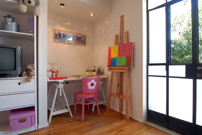 לילדה החובבת ציור ואמנות עיצבה גפן, פינת עבודה צבעונית הממוקמת בתוך נישה בין ארון לקיר. השולחן הלבן עם רגלי החמור, מזכיר שולחנות עבודה של נגרים או אמנים ונבחר בגלל האווירה הקריאטיבית שהוא משרה. משטח העבודה עשוי זכוכית שקופה שחושפת את מה שמונח במגירה שמתחתיו ומקלה על התמצאות בחלל.