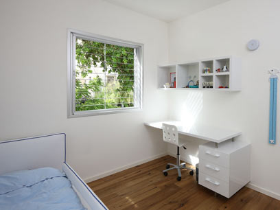 בכוורת התלויה מוצגים צעצועים ומשחקים ובעתיד ניתן יהיה לאכלס בה ספרים. הסגנון הלבן והנקי נבחר גם מתוך ראייה לטווח רחוק – עיצוב פינת העבודה מתאים לכל גיל ו"יגדל" עם הילד. בפינת העבודה הוכנו כל התשתיות עבור מחשב, כולל פתח להעברת כבל חשמל במשטח העבודה.