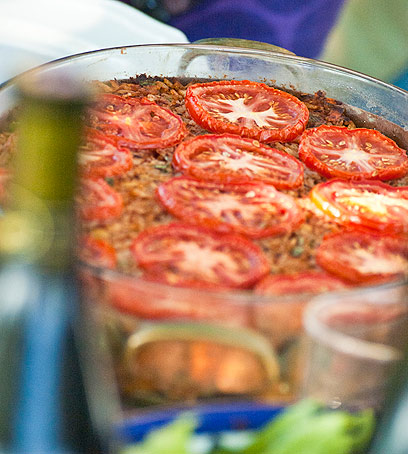 - מוסיפים את האורז, החומוס, מיץ הלימון והפטרוזיליה לתוך הרוטב, מערבבים ויוצקים את התערובת על החצילים והעגבניות ומניחים מעל הכול את פרוסות העגבנייה שהשארנו בצד. אופים כחצי שעה בתנור.