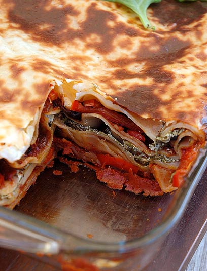 - מסדרים את שכבות הלזניה: יוצקים שליש מהרוטב האדום לתחתית תבנית אפייה ומכסים בשכבה של עלי לזניה. יוצקים מעל עוד שליש מהרוטב האדום, יחד עם שלושה רבעים של תערובת הפלפלים והבצל, ומכסים בעלי לזניה. מכסים בתערובת התרד ומניחים מעל שכבה נוספת של עלי לזניה. יוצקים את שארית הרוטב האדום, יחד עם שארית תערובת הפלפלים והבצל והפטריות המטוגנות, ומכסים בשכבה אחרונה של עלי לזניה. יוצקים מעל הכול את הרוטב הלבן.