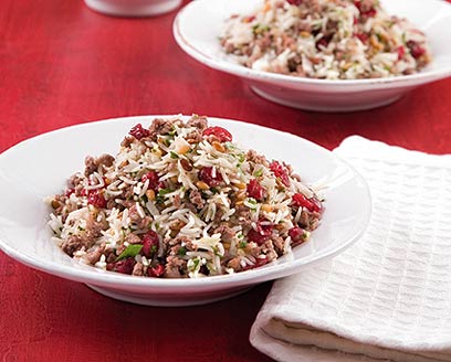 טלה טחון מוקפץ עם אורז וצנוברים